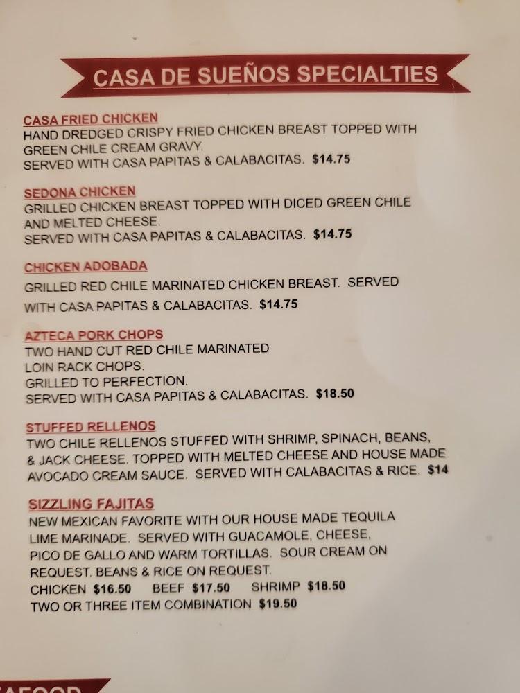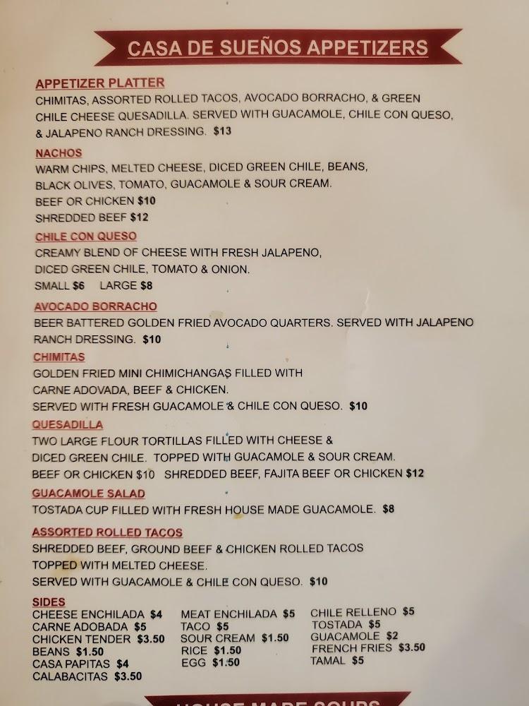 The menu at Casa De Suenos features a variety of beloved New Mexican dishes. Diners can find unique appetizers like nachos and guacamole salad. Satisfying entrees include enchiladas and stuffed sopapillas. For seafood lovers, the Sonoran Salmon and ribeye steak are popular choices. Sides like Casa Papitas and beans complement the dishes perfectly. The restaurant also offers vegetarian options, ensuring everyone finds something to enjoy. Desserts are not to be overlooked, with delightful sweet treats rounding off the meal. Suitably priced, the menu provides quality food for all tastes, inviting guests to share.